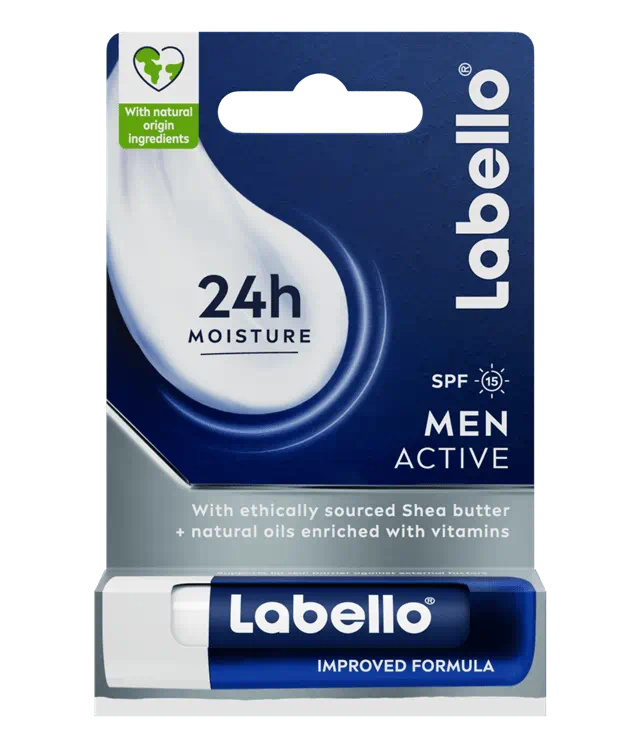 Intense hydration for active men! 💪 Labello 24H Moisture Lip Balm Men Active keeps your lips smooth and protected all day.”